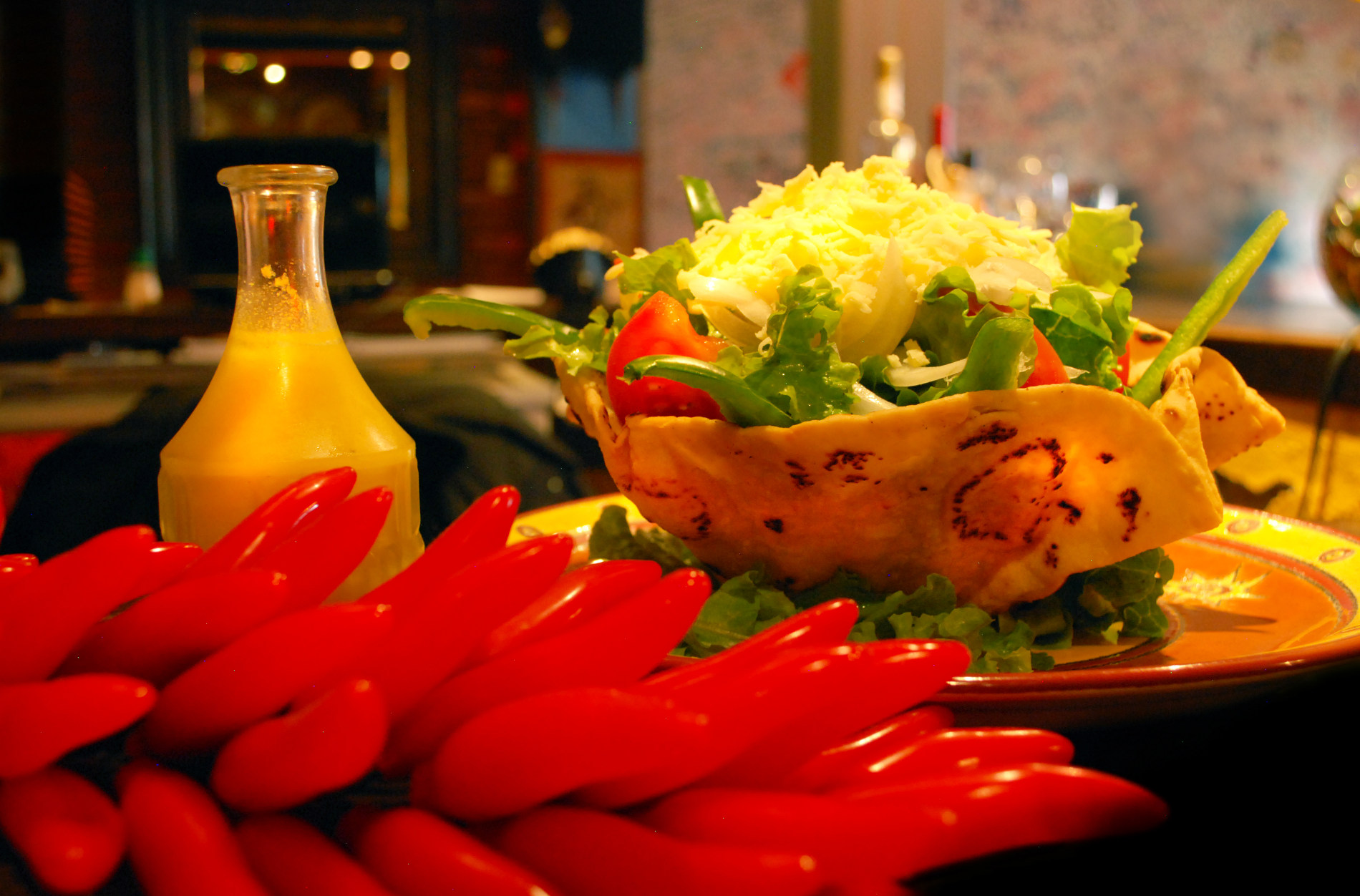 Ensalada en una tortilla frita rellena de lechuga, tomate, pimientos verdes con queso y vinagreta